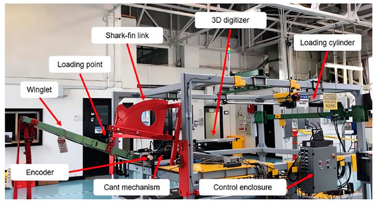 In the majority of studies, feasibility assessments are typically conducted during the design phase. However, after the fabrication of scale models or prototypes, mechanical testing is required, which is the second type of evaluation applied to the morphing winglet before its practical application. In fact, the most effective method for the aerodynamic performance testing of morphing winglets is direct wind tunnel testing [8,52,68]. However, in practical research, on one hand, many studies on morphing winglets are still at the theoretical model stage, and on the other hand, the actual performance of larger morphing winglet prototypes cannot be confirmed only theoretically. Blindly conducting wind tunnel experiments would increase unnecessary costs [5], so wind tunnel testing has not been widely used in the research on morphing winglet technology. Therefore, the focus of such evaluations is to design a specialized testing instrument that can simulate the loads experienced by the winglet during morphing in a more cost-effective and direct manner, allowing for the assessment of the winglet’s mechanical strength. Buchkazanian [93] designed a loading test device for testing the load-bearing capacity of variable-angle winglets (Figure 19). This dynamic device, controlled by a linkage mechanism, has a loading cable at its end that wraps around a camber-shaped guide device and connects to the structure under test, ensuring that the load applied at the loading point is perpendicular to the wing surface. This device can accurately control the angle and the magnitude of the load, provided that the center of gravity of the guide device is not too close to the wing; otherwise, the test results for the load would be unstable.