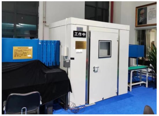 The experiment described in this paper was carried out in the D7 wind tunnel at Beihang University (Beijing, China), with a focus on measuring aerodynamic noise and cavity velocity. The D7 wind tunnel is a small, closed-circuit system featuring a low-noise fan and a micro-porous plate muffler in the power section to reduce noise. Additionally, the tunnel walls are lined with soundproof material for further noise reduction. The test section is 500 mm long with a square cross-section of 200 mm × 200 mm. Turbulence in the jet core is maintained at less than 0.1%, and the experimental wind speed ranges from 0.1 to 40 m/s. The test section is enclosed by a small anechoic chamber, as shown in Figure 1, with dimensions of 1.4 m in length, 1.6 m in width, and 1.9 m in height.