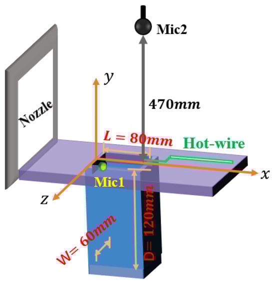 The cavity model is mounted on a plate that runs parallel to the flow direction, with the plate’s leading edge connected to the wind tunnel nozzle, and the cavity positioned 100 mm downstream from it. Both the flat plate and cavity are made of aluminum alloy. Two microphones were used simultaneously during the experiment. As shown in Figure 2, Mic2 is a Brüel & Kjær Type 4189 1/2” microphone (Brüel & Kjær, Nærum, Denmark) for measuring far-field noise, positioned 470 mm directly above the rear edge of the cavity. Mic1, a G.R.A.S. 1/4” surface microphone (G.R.A.S. Sound & Vibration, Holte, Denmark), was placed on the front surface of the cavity’s inner wall when testing the slanted configuration of the rear wall. The flow field data were acquired using a StreamLine CTA (Constant Temperature Anemometer) (Dantec Dynamics, Skovlunde, Denmark) from DANTEC. A single one-dimensional hot-wire probe 55P11, as shown in Figure 1, was positioned 13 mm directly above the center of the cavity’s rear edge. The sampling frequency for both the hot-wire signals and acoustic signals is 25,600 Hz, with a sampling time of 50 s. When analyzing these signals using Fast Fourier Transform (FFT), the Tukey–Hanning window function is applied. The FFT is set to 6400 points with a 50% overlap, resulting in a frequency resolution of 4 Hz. The FFT results of each segment are subsequently averaged to improve the spectral accuracy.