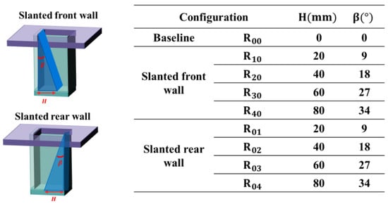 Different wall slant configurations were investigated experimentally to control self-excited oscillation noise for cavity configurations where self-excited oscillation noise and acoustic resonance noise are coupled. Previous studies have shown that a cavity of 80 mm in length, 60 mm in width, and 120 mm in depth has a coupled noise, so this configuration was chosen as the base configuration. The dimensional parameters of the inner wall slant configuration in the experiments are shown in Figure 3. The experimental design of the front and rear wall slant configurations, where β is the slant angle, was carried out for a total of eight noise reduction configurations with four slant angles of 9°, 18°, 27°, and 34° on the inner wall, respectively. Experimental far-field noise measurements were carried out for the different configurations with the microphone located 470 mm directly above the rear wall surface of the cavity. The experimental measurement velocity ranges from 10 m/s to 35 m/s, with a flow velocity interval of 1 m/s.