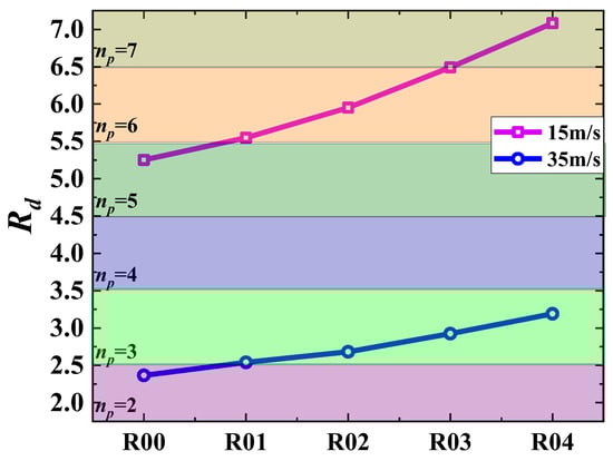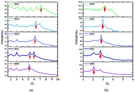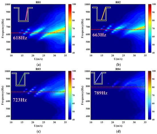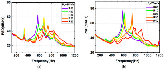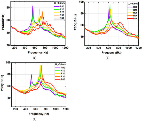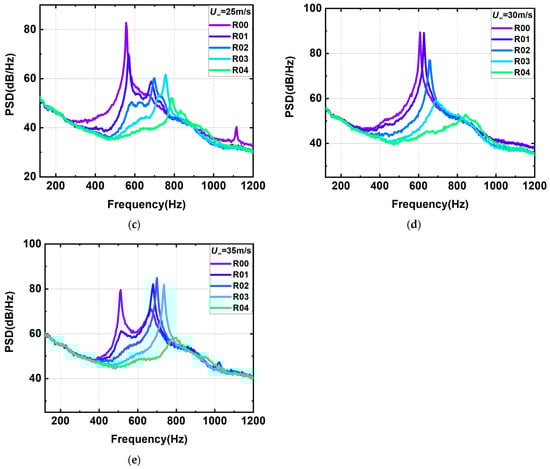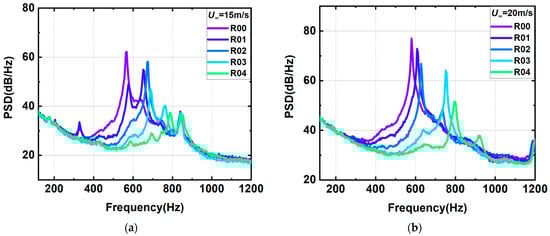 The switching pattern of this dominant mode is therefore studied specifically for the two velocities of 15 m/s and 35 m/s. Figure 11 shows a comparison of the power spectral density at 15 m/s and 35 m/s, with the horizontal coordinates normalized according to the calculated in Equation (4). It can be seen that the frequencies of excitation are not uniform at different slant angles and that the dominant mode of excitation changes. As the slant angle increases, the dominant mode gradually switches to a higher mode. Figure 11 shows that when the velocity is 15 m/s, the dominant mode of the baseline configuration is mode 5 and the slant angle increases; the dominant modes of R01, R02, and R03 are mode 6, the slant angle continues to increase, and the dominant mode of the R04 configuration is mode 7. When the velocity is 35 m/s, the dominant mode of the baseline configuration is mode 2, the slant angle increases, and the dominant mode of the R01, R02, R03, and R04 configurations are all mode 3.