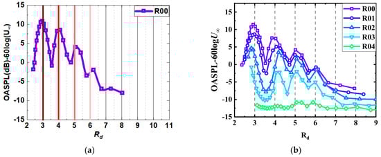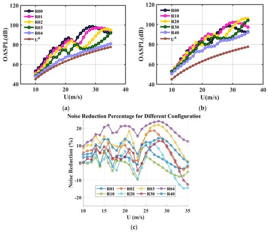 Figure 6 shows the comparison of the overall sound pressure level results for the wall slant configuration. The phenomenon of local maximum and minimum values of the overall sound pressure level of the baseline configuration will still exist for the inner wall slant configuration. This intensity variation in the far-field noise was shown in previous studies to be influenced by the locking-on noise. Figure 6 shows the overall sound pressure level of the measured configuration compared to the variation in , indicated by the brown line. The typical dipole sound source mechanism excitation characteristics are based on the law of , i.e., turbulent fluctuations close to the rigid surface. Therefore, the acoustic power can be normalized by in the absence of significant acoustic resonance or feedback in the cavity due to the interaction of the shear layer with the downstream cavity wall. As can be seen from the figure, the trends in acoustic power changes for different cavity configurations with slanted inner wall surfaces all coincide with . However, due to the change in the effective depth of the cavity after the wall slanting, the location where the local maximum of the sound pressure level appears will change. In terms of the noise reduction effect, as shown in Figure 6, the noise reduction improves with an increase in the slant angle. Among the measured configurations, R04 demonstrates the best noise reduction performance, achieving a maximum reduction of over 10%. Additionally, the noise reduction effect of the rear wall slant configurations (Figure 6a) is more pronounced compared to the front wall slant configurations (Figure 6b), as evidenced by the higher overall noise reduction percentages in Figure 6c.