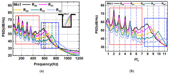Power spectral density of near-field noise in the inner rear wall slant configuration measured by Mic 1 from 10 m/s: (a) original frequency; (b) normalized frequency.