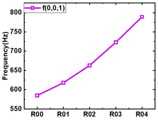When changes from to , the dominant mode is n. The maximum value of the overall sound pressure level intensity occurs at and the corresponding frequency prediction equation for the dominant mode is Equation (2). The effect of the same slant angle on the acoustic resonance is the same whether the front or rear wall surface is slanted. Therefore, the coupling influence study is carried out for the rear wall face noise reduction configuration with a better noise reduction effect.