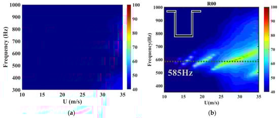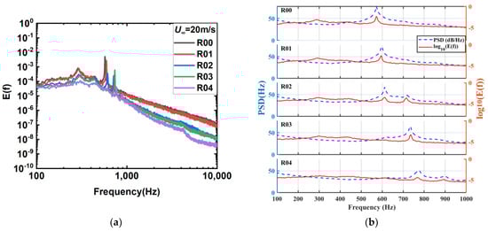 The hot-wire measurements further support these findings, as shown in Figure 15, which presents the energy spectrum of velocity fluctuations at a speed of 20 m/s. The results indicate that the dominant frequencies of velocity fluctuations align closely with the far-field acoustic results, demonstrating a strong correlation between vortex shedding dynamics and acoustic resonance within the cavity. This alignment suggests that the vortex shedding and cavity’s coupled noise (arising from the interaction between self-sustained oscillations and acoustic resonance) are consistent, highlighting a strong flow–acoustic coupling. Additionally, the comparison between velocity fluctuation spectra and acoustic spectra shows that the rear wall slant configurations significantly reduce energy in the high-frequency range compared to the baseline configuration (R00). This suggests that the slanted rear wall structure disrupts the coherence of small-scale turbulent vortices and weakens the feedback loop between vortex shedding and acoustic resonance. By doing so, the coupling mechanism between the shear layer and the cavity’s acoustic modes is suppressed, mitigating self-excited oscillations and reducing noise generation. These observations further confirm that the slanted rear wall configurations, particularly R04, effectively alter the dynamics of vortex shedding and acoustic coupling, highlighting their potential for noise mitigation in cavity flows.