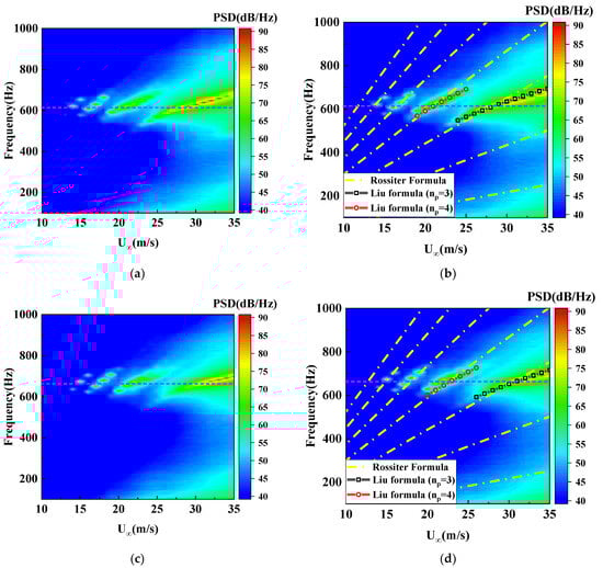 Figure 9 shows the far-field power spectral density plot for the baseline configuration, with the measured acoustic resonance frequencies shown as dashed lines in the plot, based on the acoustic resonance frequencies in Figure 8. Figure 9 shows the far-field power spectral density contour of the slanted configuration at the rear wall of the cavity, where the acoustic resonance frequencies are indicated by dashed lines. Firstly, comparing the noise results for the different slant configurations, the excited modes of the self-excited oscillatory noise are always concentrated near the acoustic resonance frequency due to the coupling of acoustic resonance and self-excited oscillation that occurs. The corresponding dominant mode is always near the acoustic resonance, so it is this coupling effect that leads to the appearance of local maxima in the overall sound pressure level. It is easy to see from Figure 10 that as the acoustic resonance frequency of the different configurations gradually increases with the slant angle, the dominant mode selection is affected by the coupling effect.