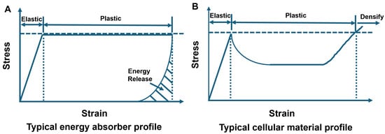 Typical stress vs. strain profile of (A) a generalized energy absorber, and (B) a cellular material.