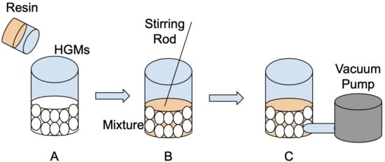 Schematic of HGM-PU composite foam manufacturing. (A) Combine polyurethane elastomer with K46 HGMs; (B) Create a homogeneous mixture; (C) Pull vacuum to remove air.