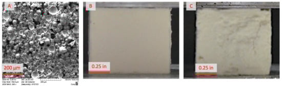 Samples prepared for testing. (A) An SEM image of a cross-sectional view of HGM-PU composite foam; (B) 40% volume fraction sample, and (C) 65% volume fraction sample (red scale is 6.35 mm).