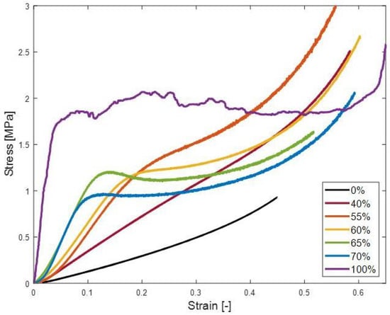 Stress–strain performance for HGM-PU composite foams manufactured using different HGM loading. The 0% sample has no HGMs and is a neat elastomer, while the 100% sample is manufactured using the sintering process.