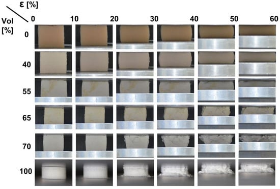 Figure 5 presents a series of images depicting uniaxial compression testing on test samples with varying HGM loading. With increased HGM loading, the HGM-elastomer foams show more brittle failure under compression, resulting in material spalling, or breaking into small pieces. Conversely, samples with lower HGM loading do not experience spalling but instead demonstrate elastic behavior. As the 40 vol% sample is compressed to higher strains, the material bulges or is displaced in the lateral direction. Overall, this sample experiences little to no visible damage. Once the force is removed, the sample returns to its original shape within 10 min. This indicates that permanent deformation of the foam is minimal, resulting in its reversible behavior. When reviewing the images from the 70 vol% sample, spalling is immediately noticeable. The image of 70 vol% at 40% strain shows the sample breaking apart into several pieces due to the matrix’s inability to hold the sample together at high strain. For samples at these higher HGM loadings, the response is dominated by the crush response of the HGMs and the low volume fraction of the elastomeric matrix is insufficient to ensure that the HGMs remain bonded, especially under higher strains. As a result, these samples are more prone to spalling. It is important to note that the random packing fraction of polydispersed spherical objects is known to be around 70%, making it hard to achieve a significantly higher HGM loading [41]. Lastly, the 100 vol% samples without the matrix material experienced brittle failure.