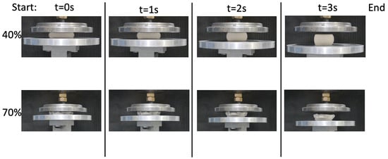 The elasticity of HGM-PU composite foams with varying HGM loading was observed when the top platen was removed from the compressed samples. Upon removal, the samples began to decompress and partially return to their original shape. This rebound was noted in most samples with different sphere volume fractions, but to varying degrees. In Figure 6, the rebound of the 40 and 70 vol% samples are shown. As the top platen is being removed after the samples were compressed up to 65% strain, it appears that both samples have some amount of instantaneous recovery. The top row in the Figure, which depicts the 40 vol% sample, has no visible cracks or deformations after the load is entirely removed. This is to be expected because the HGM loading is low, and the rebounding is controlled by the PU matrix. On the other hand, the 70 vol% sample developed permanent deformation, which can be seen by the cracking along the outer surface. However, even with this permanent deformation, these samples are still able to regain some of their original shape. This is due to the elastic matrix being present, even if it is in small quantities.