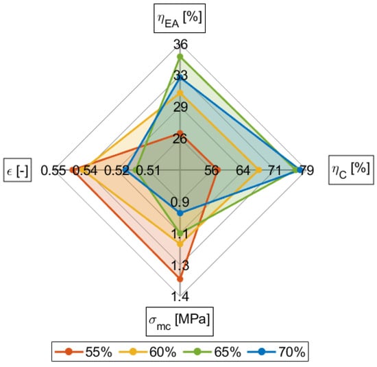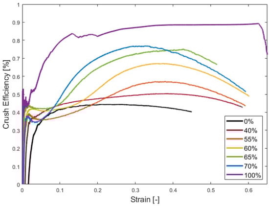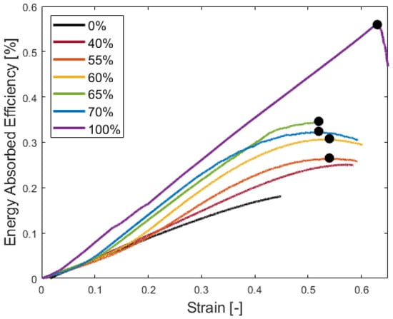 Stress–strain data shown in Figure 4 is used to calculate the energy absorption efficiency (). These curves are nearly linear until a maximum energy absorption efficiency is achieved. The strain at the peak energy absorbed efficiency corresponds to the onset of densification for the samples [37,38,39,40] or when