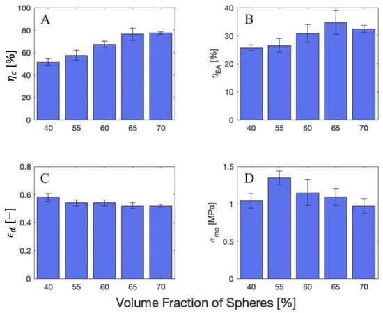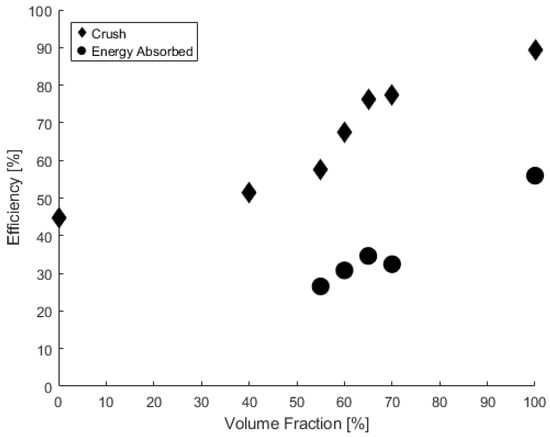 Similarly, as HGM loading increases, the peak energy absorption efficiency also increases. The energy absorption efficiency () increase was measured from 18.78% for the 0 vol% sample to 55.96% for the 100 vol% sample. These two trends emphasize the importance of selecting the desired HGM loading for the given application (Figure 9). The 100 vol% sample exhibits the greatest crush and energy absorption efficiencies, however, the HGM–PU composite is more durable and less prone to brittle fracture.
