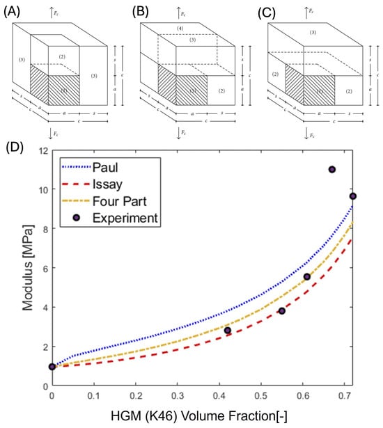 The Representative Volume Element (RVE) for the analytical models adopted from Bourkas et al. [42]: (A) Paul Model; (B) Issay-Cohen Model; (C) Four-Part Model. (D) The experimental moduli are plotted versus HGM loading along with predictions from the Paul, Issay-Cohen, and Four-Part Models.