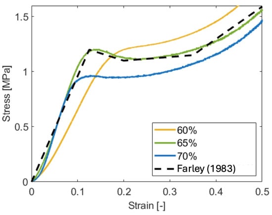 The Farley Model of a typical cellular material plotted as a stress–strain curve alongside the 60, 65, and 70% samples [13].