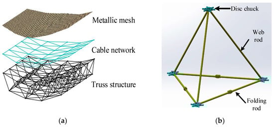 The deployable truss antenna consists of a truss structure and a cable–mesh system that uses a network of cables and metallic mesh, as shown in Figure 2a. The cable–mesh system is connected to the nodes on the front surface of the truss structure; therefore, the accuracy of the truss structure plays a critical role in the surface accuracy of the antenna. The truss structure contains disc chucks, web rods, and folding rods, of which one tetrahedral truss element is shown in Figure 2b.