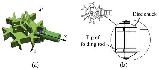 In this section, the model of the revolute joint connecting the disc chuck and the folding rod is presented. The coordinate system of the revolute joint is shown in Figure 4.