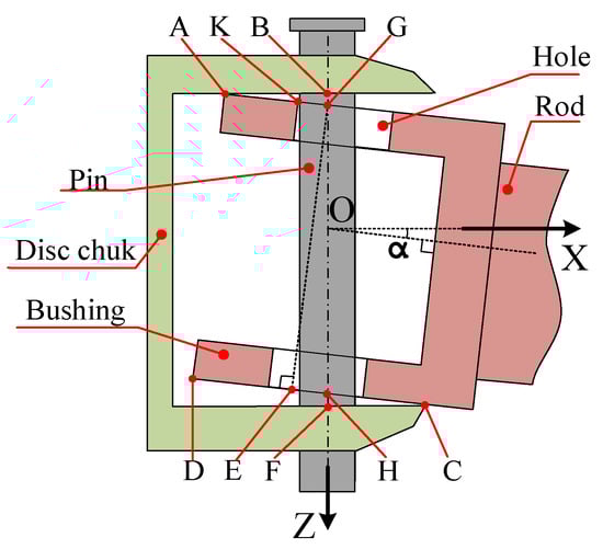 Due to the constraint of the disc chuck structure, the rod cannot realize arbitrary rotation or offset. When the spherical joint clearance reaches its maximum offset without rotation, Figure 11 shows one of the joint configurations.