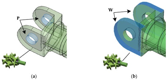 Figure 5b,c shows two different configurations of the joint rotating around the Y-axis when the revolute joint clearance reaches its maximum rotation.