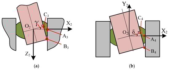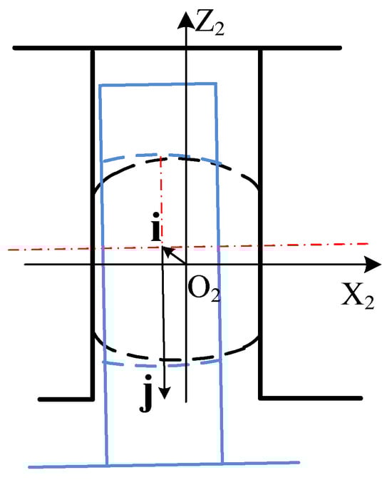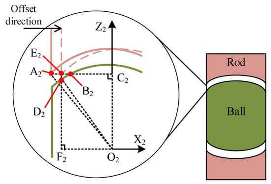 When A2 reaches point E2, D2E2 is the residual clearance value in the Z2-axis direction. When A2 reaches the point B2, the D2E2 is equal to zero. According to the geometric relationship in Figure 11, the quadrilateral E2F2O2C2 is a parallelogram, and D2E2 can be obtained as follows: