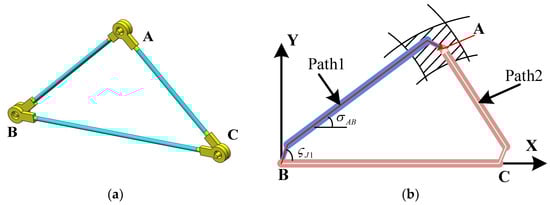 This section presents a simple planar closed-loop mechanism for error analysis on the transfer path, which comprises three rods, as shown in Figure 15a. A two-dimensional connecting model was adopted for its revolute joints. In Figure 15b, the actual motion range of point A is in the contour shading area, which is constrained by BA and CA.