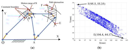 The shape of the scatter points obtained is approximately quadrilateral, as shown in Figure 22b, consistent with the results of the traditional method. The positions of points E and F, which are the lower and upper boundaries of the motion range, were considered for comparison. The comparative analysis of this example is illustrated in Table 1.