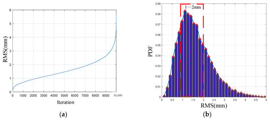 The probability distribution of the truss structure’s surface accuracy can be obtained via the Monte Carlo method. The maximum number of iterations is set to 10,000. The probability density function and the probability distribution function (PDF) of the RMS are shown in Figure 25a and Figure 25b, respectively.