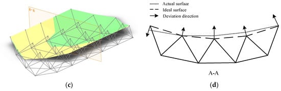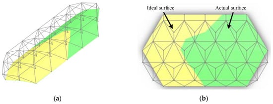 Figure 25a shows that the curve is continuous and smooth, indicating that the accuracy analysis is effective. As shown in Figure 25b, the RMS of the truss antenna is mainly in the range of 1–2 mm, the probability of which is more than 0.5. The maximum RMS of the antenna is within 5 mm. Figure 26 shows one of the configurations of a truss antenna with 5 mm RMS. Yellow represents the ideal surface, and green represents the actual surface.