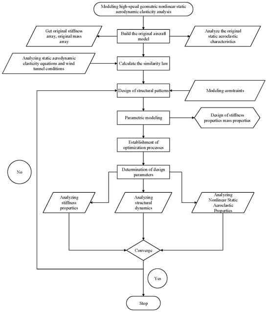 It is necessary to verify whether the structural dynamics equations constructed in the test model are similar to the target structural dynamics equations, and therefore, the test model is subjected to stiffness analysis, structural dynamics analysis, and static aeroelastic analysis. Since the model must eventually be tested in a wind tunnel, it is also necessary to conduct a strength test on the model to determine the strength limit of the model and then determine the working conditions in the blowing wind. The flowchart for static aeroelasticity modeling is shown in