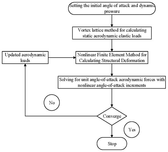 4]. The wings of large aircraft are generally of high-aspect-ratio configuration and are increasingly made of composite materials, which increases the flexibility of the wing and worsens its static aeroelasticity problem. At present, most airliners have high deformation, the cruise profile is inconsistent with the profile of the frame, the center of gravity position is changed in the structural aspect, the aerodynamic focus is moved forward, and the torsional deformation will reduce the finite angle of attraction. These factors may lead to changes in the aerodynamic characteristics, such as a reduction in the lift coefficient, reduction in the lift–drag ratio, and change in the moment of drag. In addition to these conventional static aeroelasticity problems, the geometric nonlinear problems of a high-aspect-ratio elastic wing and the static aeroelastic problems caused by the high flexibility of the new high-aspect-ratio wing structure are particularly serious, and the maximum elastic deformation of the wing can sometimes be up to 25% of the wing length [