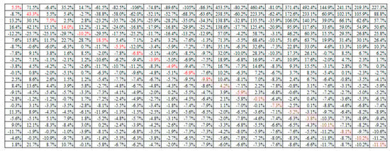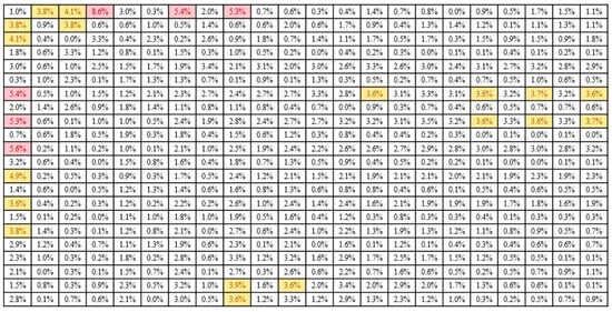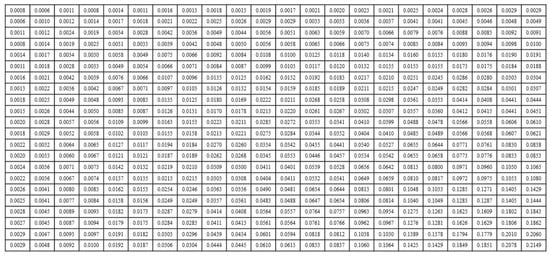 The resultant error in the flexibility influence coefficient matrix of the optimized test model compared to the original model’s flexibility influence coefficient matrix is shown in