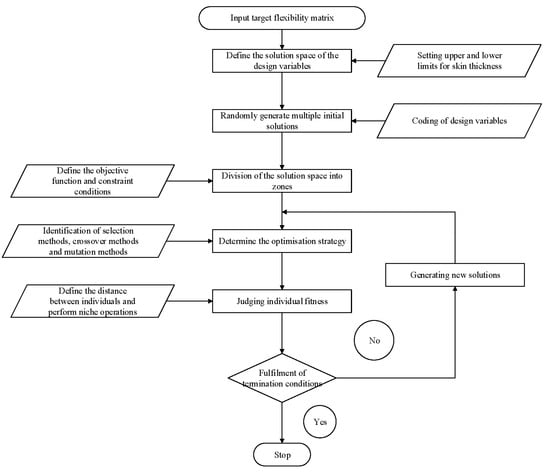 The application of the multi-island genetic algorithm to solve the problem presented in this paper requires the solution space of the optimization problem to be determined first. Because this paper needs to apply the stiffness quasi-isotropic nature of the material, the minimum thickness of the skin should be not less than the thickness of four layers of carbon fiber, i.e., 0.2 mm, and through the analysis of the optimization model of the target stiffness matrix, the maximum thickness of the skin is 10 mm. After that, according to the objective function and constraints to define the fitness function of the individual, the algorithm randomly generates the initial population in the solution space. The multi-island genetic algorithm should also define the distance between any individuals to divide the solution space to ensure the global property of the optimization algorithm. The design variables are encoded in each sub-solution space, and after calculating the fitness for each individual, selection, crossover, and mutation operations are performed on each individual to generate a new population. The fitness is also calculated and iterated sequentially until the selection of individuals that satisfy the objective function occurs. The optimization process for the case of this paper is shown in