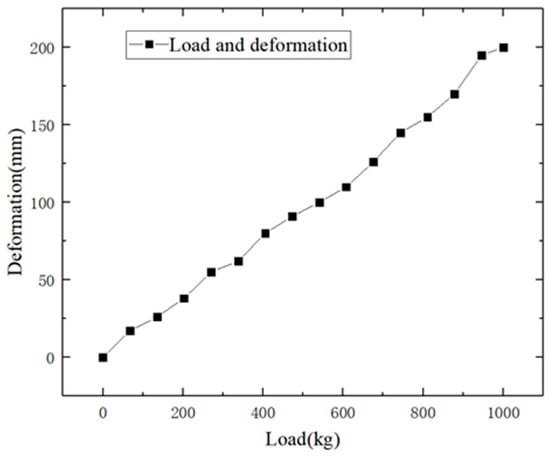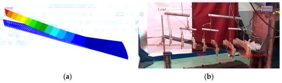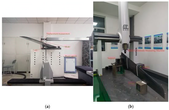 If the nonlinear static aeroelastic properties of the wing geometry are investigated, the model needs to be strong enough. The loads for the strength test of the model are obtained from the fluid–structure coupling calculation, the total load is applied to the test model by adopting the lever principle, and the loads and deformations of the test model are as shown in
