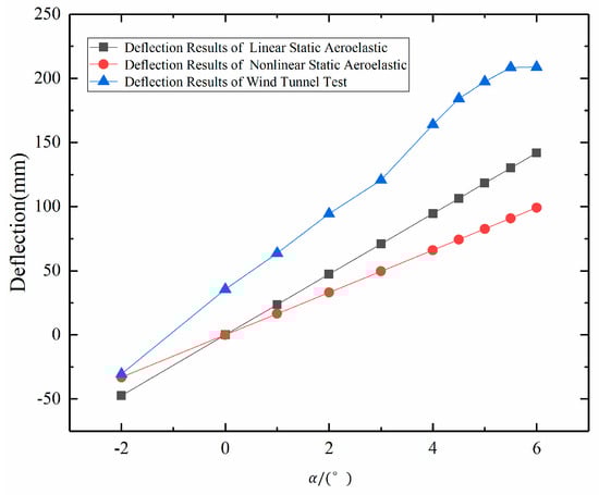 The simulated linear static aeroelastic deflection results and nonlinear static aeroelastic deflection results are linear with angle of attack. The simulated nonlinear static aeroelastic deflection values are smaller than the values of linear static aeroelastic deflection. The deflections measured in the wind tunnel test are shown in
