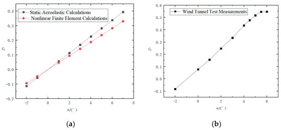 It was verified that the geometric nonlinear effects do significantly affect the lift coefficient in transonic flow. In this study, two methods, static aeroelasticity simulation and nonlinear finite element simulation, were used to calculate the lift coefficients of the model, and the calculated lift coefficients were lower than the experimental results. The lift coefficients calculated by the geometrically nonlinear analysis method used in this study were lower than those calculated for a linear rigid body, which was consistent with the experimental results. However, the simulation method in this study calculated the values of lift coefficients with large errors from the experimental measurements, which was mainly due to the lack of accuracy in the simulation results of transonic aerodynamic forces, so it becomes more necessary to develop a more advanced method of calculating the static aeroelastic properties.