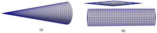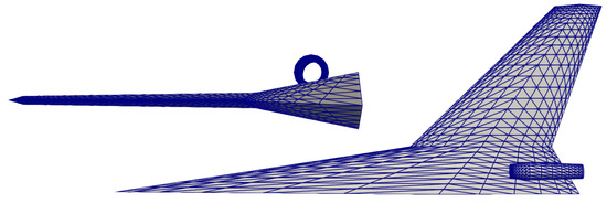 22]. This BEM is implemented on an unstructured mesh of triangles with linear–doublet–constant–source panels. The traditional Morino formulation is used to determine the unknown source and doublet strengths [