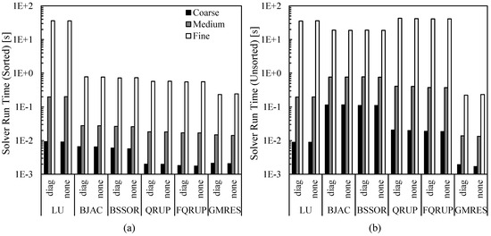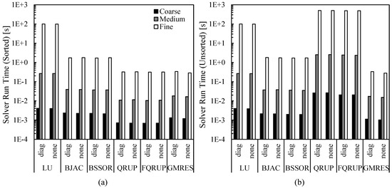 Figure 15 shows the solver run times for the wing–body–nacelle configuration. For this case, the QRUP and FQRUP solvers were the fastest out of all solvers for the sorted system. The BJAC and BSSOR solvers failed to fully converge for the coarse- and medium-density meshes with the system sorted, and so the timing results for these cannot be considered.