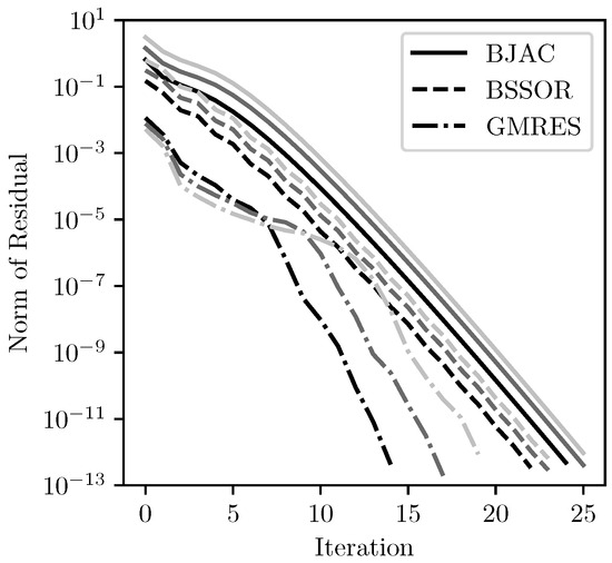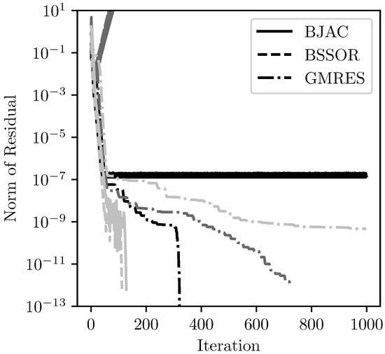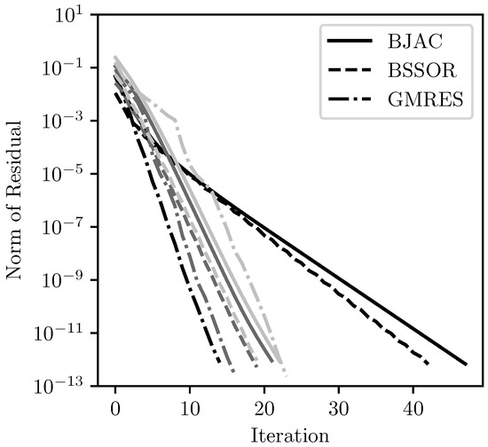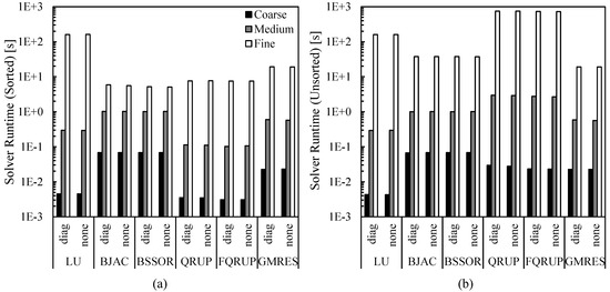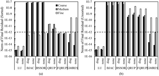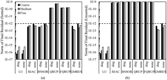 For each solver, the total time required to sort the linear system (or not), apply the diagonal preconditioner (or not), and solve the system was recorded and then averaged over five repeated tests. The norm of the final residual vector was recorded (again averaged) to assess the accuracy of each solver. All tests were run on an OnLogic (South Burlington, VT, USA) K801 workstation with an Intel i9 24-core processor and 64 GB of RAM.