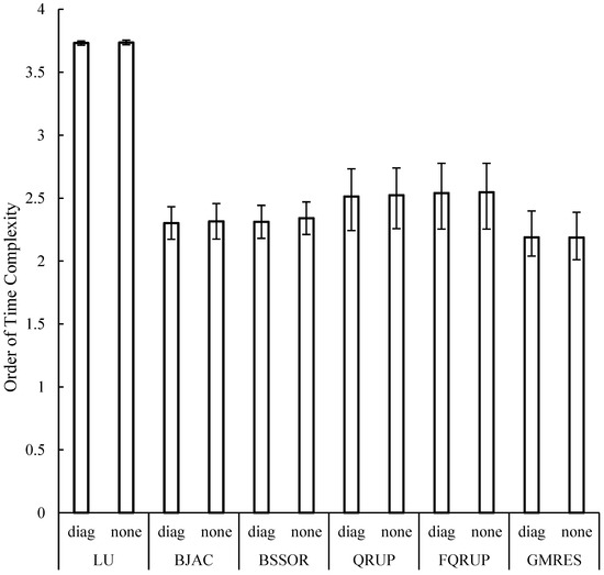 Figure 18, the FQRUP solver had a slightly higher average time complexity than the QRUP solver. Their time complexities should be the same, since the two methods require similar numbers of operations, and so the difference in measured time complexities would likely be eliminated by considering more cases. This can be seen in the variation of these time complexities.