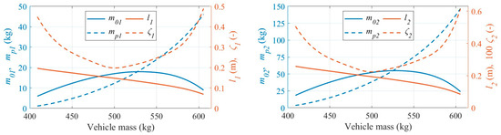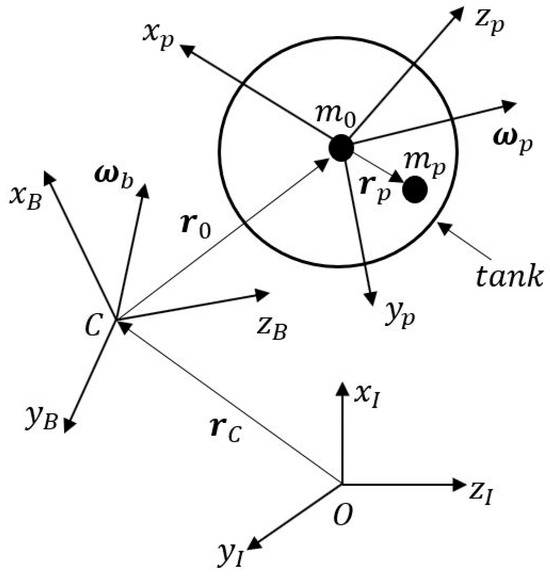 The nonlinear equations of motion for the pendulum equivalent model, as well as the mathematical expressions of the forces and moments exerted by the two masses and on the tank (and implicitly on the vehicle), are derived starting from the schematic depicted in Figure 2. The results presented shortly here are based on Ref. [19], further details being provided there. For simplicity, the equations below do not employ any subscript relating the vectorial quantities to a specific reference frame. Nevertheless, it can be noted that, to be employed in the equations of motion, the sloshing force and moment must be expressed in the inertial frame and body-fixed frame, respectively.