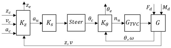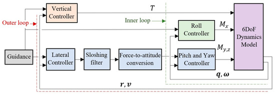 The control architecture of the ADAMP was selected based on its available control elements (actuators) and it is shown in Figure 3. Essentially, the control architecture comprises an outer loop, controlling the position and velocity, and an inner loop, controlling the attitude, connected in a cascade-like fashion. The outer loop is divided into two controllers, one for altitude, for which the required control force will be provided by the rocket engine, and one for lateral position (both and ), for which the control forces will be realized by tilting the vehicle to the required direction using the TVC system. The inner loop is divided into two uncoupled controllers, one that controls the roll angle and one that controls the pitch and yaw angles (rotation about the and axes, respectively). Clearly, the separation is motivated by the fact that the respective control torques will be realized by different systems, that is RCS and TVC, respectively. The lateral and pitch controllers (pitch and yaw or simply denoted as pitch angles) are connected through a low pass filter (sloshing filter) for sloshing suppression.
