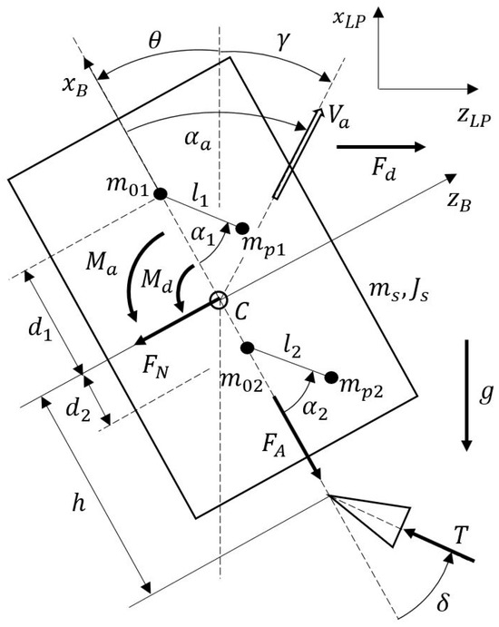 The two-dimensional equations of motion can be derived by simply examining the model in Figure 4. The forces acting on the vehicle are thrust , aerodynamic normal force , aerodynamic axial force , gravity , the sloshing force , and disturbance force . Similarly, the moments acting on the vehicle would be due to thrust, aerodynamic moment , sloshing moment , and disturbance moment . Using the small angle assumption, i.e., and , the partially linearized expressions of the linear and angular momentum conservation laws will be as follows: