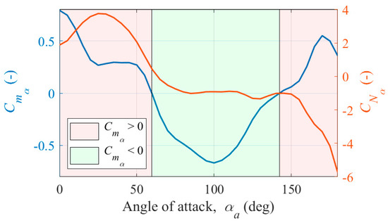 The aerodynamic derivatives and are depicted in Figure 6 for an airspeed of 20 m/s. Here, it is shown that the vehicle is statically unstable () for vertical motion () and stable () for lateral motion (). This emphasizes the importance of actively stabilizing the vehicle in vertical trajectories. The figure also shows that the destabilizing effect is stronger in ascent flight ( close to 0 degrees) than in descent flight ( close to 180 degrees) as the value of is higher.