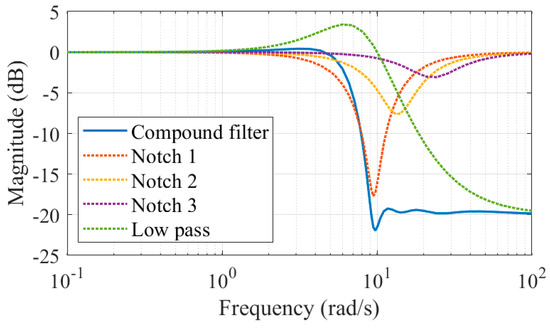 The tuning of the polynomial coefficients defining the filter parameters was performed separately from the control system tuning and was formulated as an NLP optimization problem that was solved using the fmincon solver in MATLAB. The only fixed parameter in the tuning process was the stopband attenuation coefficient , which was selected manually based on the dynamics of the operating points. The objective of the optimization problem was to maximize the bandwidth while achieving minimal phase delay and imposed stopband attenuation. Figure 7 illustrates an example of the frequency response of an optimized sloshing filter as well as its breakdown.