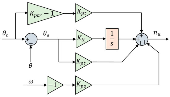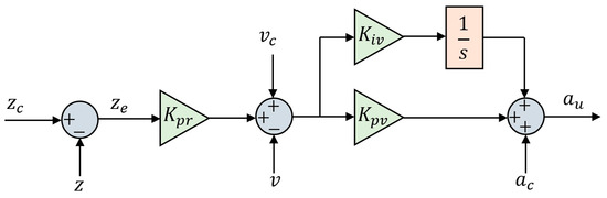 Two PID-like control structures were selected for the position (outer loop) and pitch (inner loop) controllers, and . To ensure good disturbance rejection, the lateral controller is defined by a cascaded structure with an outer loop for position and inner loop for velocity, as shown in Figure 9. Similarly, the 2-DOF PID structure shown in Figure 10 is employed for the inner loop, which ensures good disturbance rejection while limiting the overshoot. For smooth behavior between the operating points and self-adaptive properties of the control system, all the gains of the controllers, depicted with green in Figure 9 and Figure 10, are parametrized as tunable second order polynomial surfaces across the mass-thrust grid employed for the plant scheduling, similar with the one in Equation (39). A generalized state space object of the closed loop in Figure 8 was created within the Robust Control Toolbox in MATLAB, providing easy access to transfer functions between key signals for analysis and requirements definition.