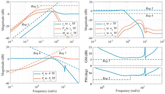 All the requirements presented above as well as their validation against the tuned control loop are shown in Figure 11. Here, the requirements are represented with dashed lines while the corresponding transfer functions are represented with solid and dotted lines. Note that for clarity, only one nominal operating point is shown in the figures below. However, the optimization for the current design resulted in a maximum H-Infinity norm of roughly , showing that all the requirements are nearly met (ideally, ) across all operating points and uncertainty ranges.