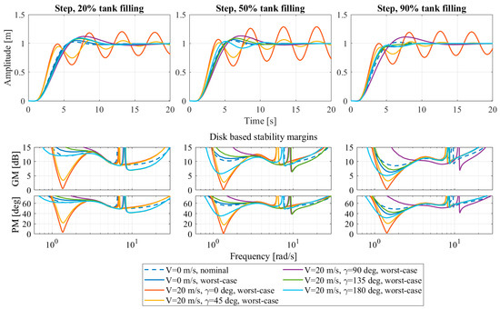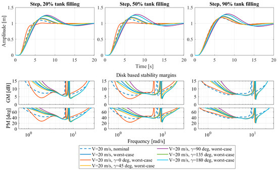 Figure 12 and Figure 13 show results at three operating points, from left to right, corresponding to tank fillings of 20%, 50%, and 90%. For each operating point, disk-based gain and phase margins (GMs and PMs, respectively) are depicted in the second row of plots and the corresponding response to a lateral position command in the first row. Each indicator shows the nominal value at zero airspeed (effectively without aerodynamic effects) in dashed dark blue, the worst-case value at zero airspeed in solid dark blue, and the worst-case value at an airspeed of 20 m/s and a range of flight path angles between 0 and 180 degrees in different colors. For each flight path angle, the aerodynamic derivatives were computed by solving the two-dimensional equations from Equations (19)–(21) for the trim states and controls. The resulting aerodynamic derivatives values were then embedded in the uncertain plant model defined in Section 3.1, replacing the uncertain aerodynamic coefficients blocks and, consequently, worst-case analyses were performed against the remaining uncertain parameters in Table 1. This approach provided a more accurate view on stability margins for a variety of trim conditions with more realistic aerodynamics, as opposed to using the wide range approximation in Table 1 for and . Moreover, since the plant model considers mostly vertical ascent and descent conditions (through the bounds of in Table 1), it was interesting to study the stability for trim conditions not accounted for in the design (lateral flight in this case). On the other hand, the first two worst-case results in Figure 12 and Figure 13 are obtained using the range in Table 1 for and at airspeeds of 0 and 20 m/s, respectively. This type of analysis was performed automatically for all the operating points, with similar results.