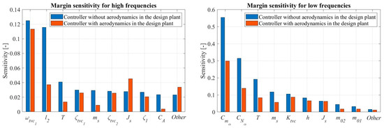 For a fair comparison between parameters, the quantity in the equation above represents a small relative perturbation taken as 10% (0.1 in absolute value) of the uncertainty range width of each parameter. Therefore, the perturbation for a certain parameter was defined as , where and represent the lower and upper bounds of parameter . The sensitivity analysis was performed for each of the operating points presented in Figure 12 and Figure 13 with similar results and, for simplicity, only results for 50% tank filling are shown in Figure 14. Since different parameters affect the stability margin at different frequency scales, the sensitivity was computed separately for low () and high frequencies ().