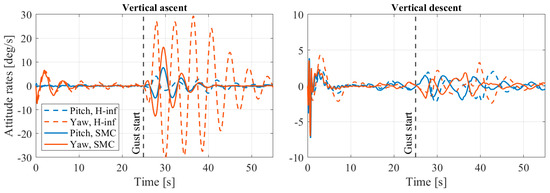 The stability and disturbance rejection capabilities of the self-scheduled structured H-Infinity and sliding mode control (SMC) designs were then analyzed in the time domain using the nonlinear 10DoF simulator developed based on the model described shortly in Section 2. This assessment considers the attitude rates of the vehicle (pitch and yaw, respectively, around the and axes in Figure 1) for vertical ascent and descent trajectories (i.e., flight path angle of 0 and 180 degrees, respectively) at a constant airspeed of 20 m/s.